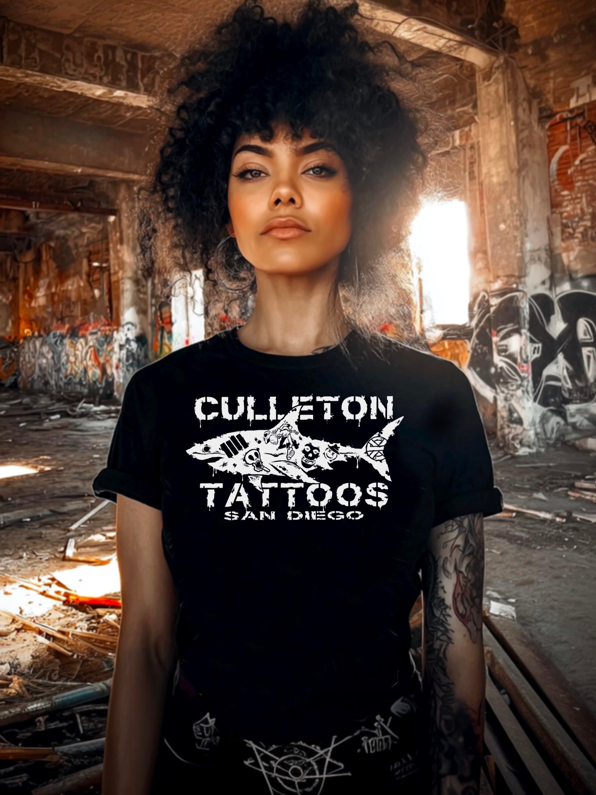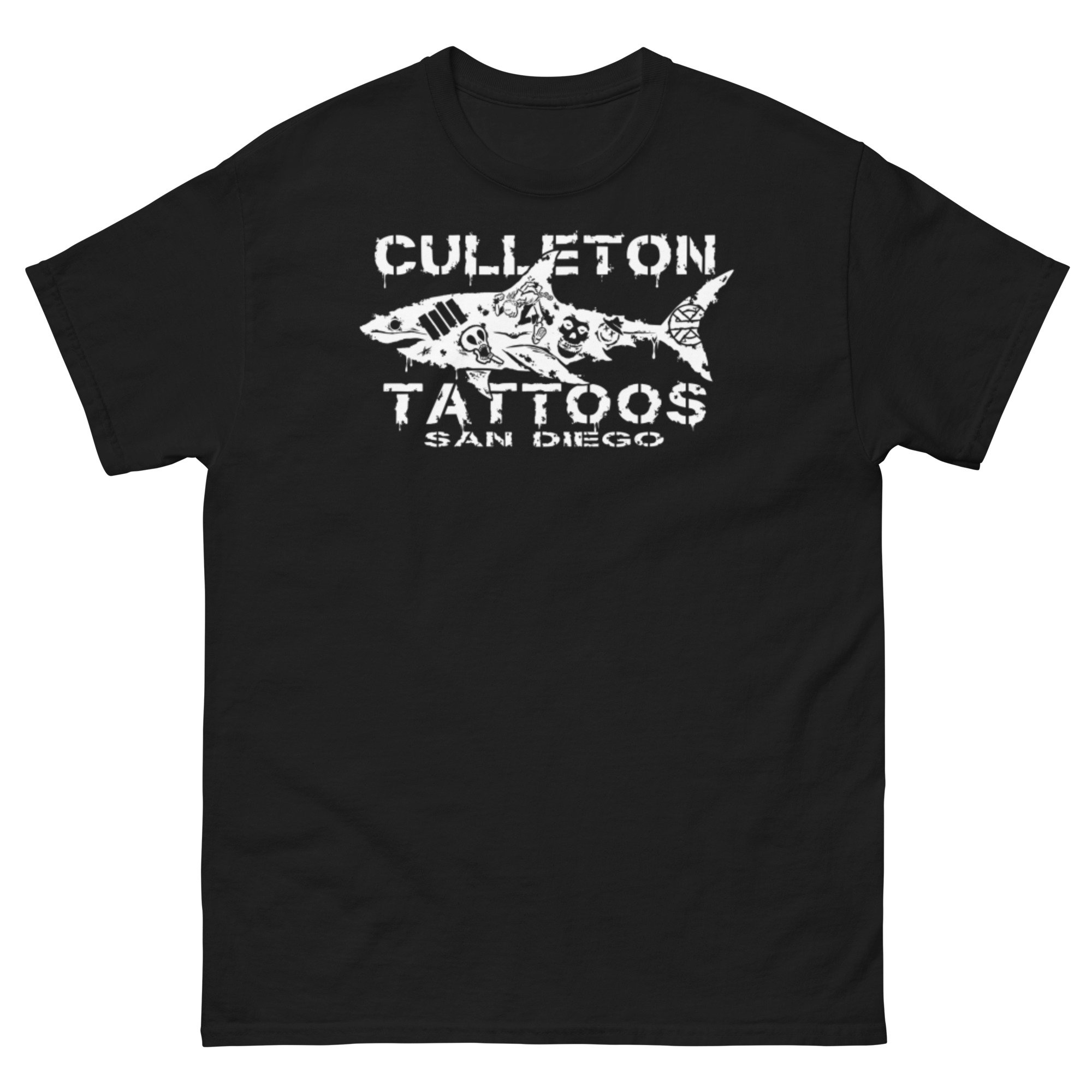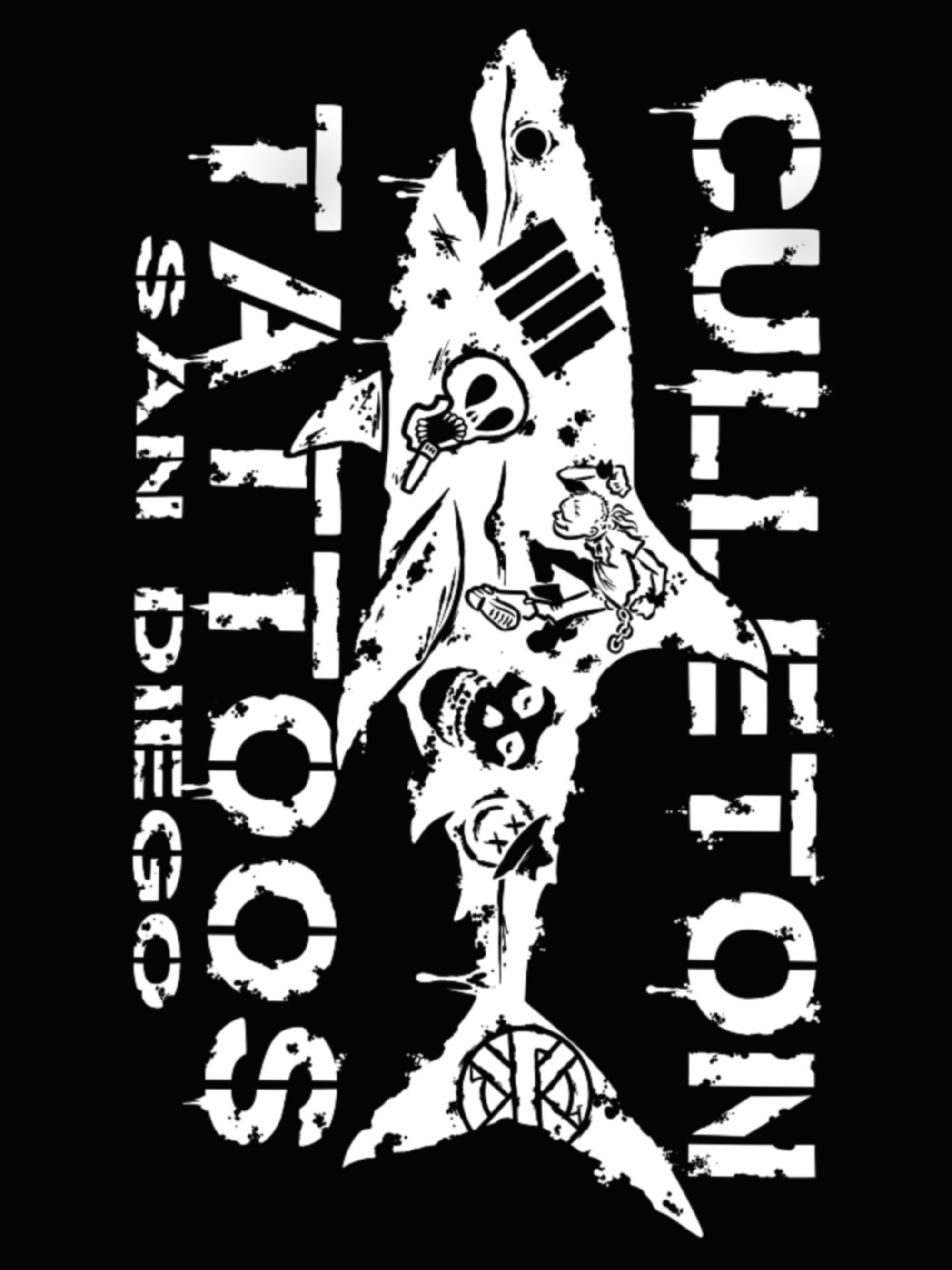 Paramore Press delivers another one of a kind design for Culleton Tattoos—the Great White Shark White-on-Black T-Shirt is pure confrontation. A stark shark cuts through the darkness, its body packed with your favorite punk logos, like a riot of noise and rebellion trapped inside a perfect predator. It doesn’t circle. It charges.
